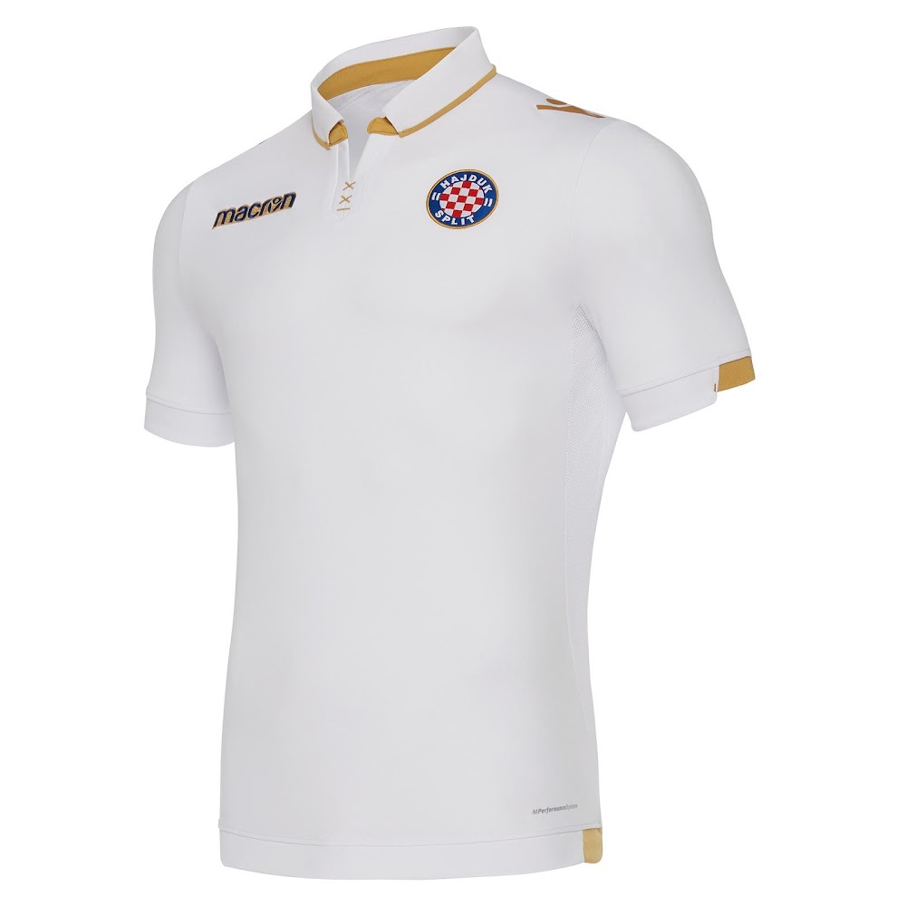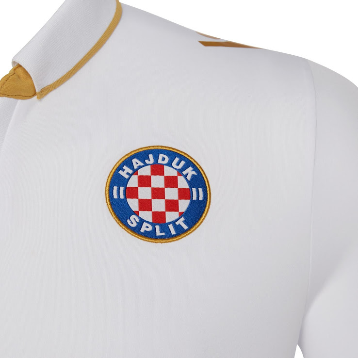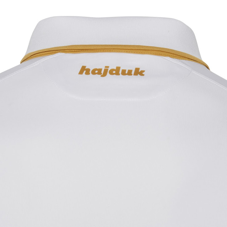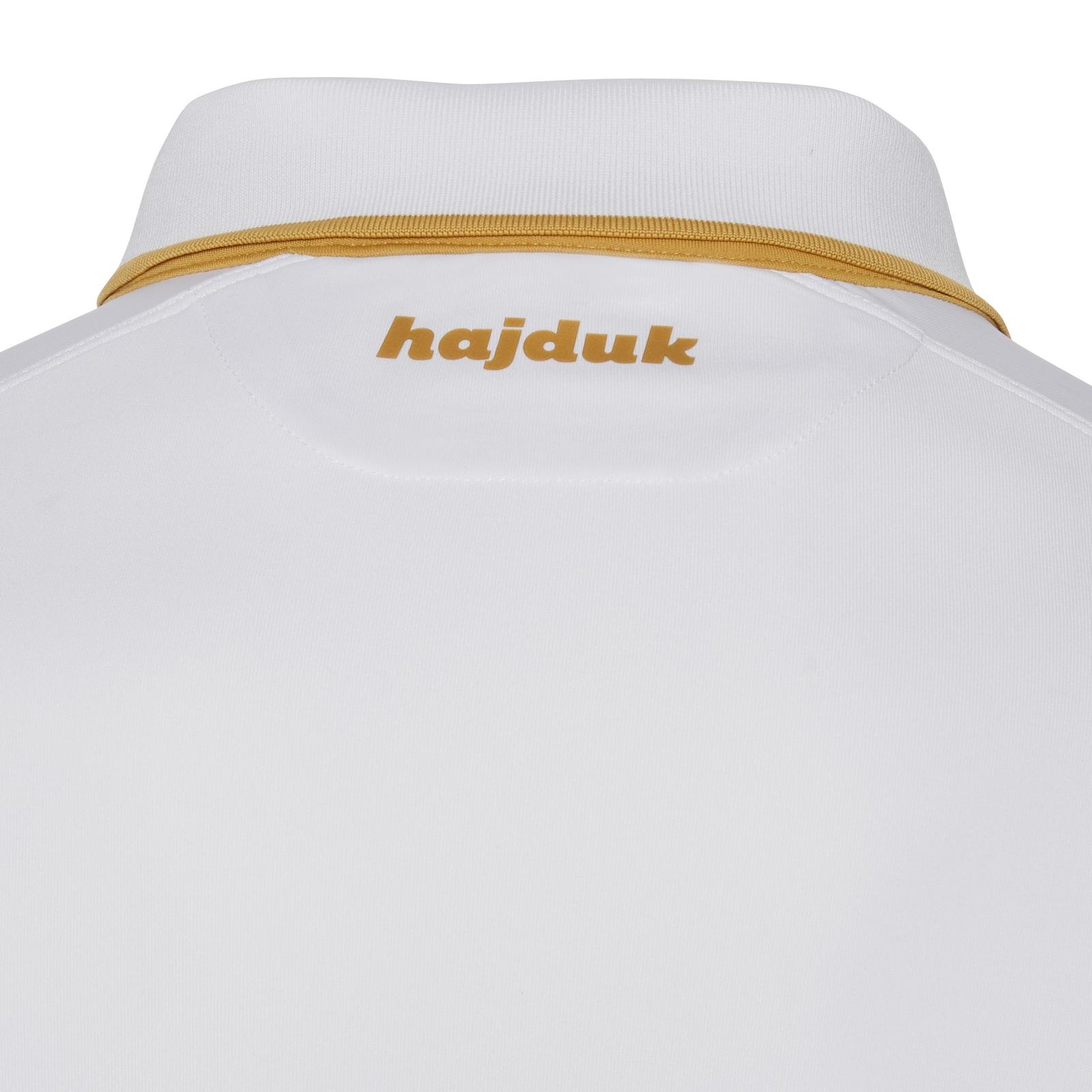 The Hajduk Split 17-18 jersey features golden details on a white background. Mesh inserts are present beneath the sleeves and on the bottom of the shirt for maximum breathability.