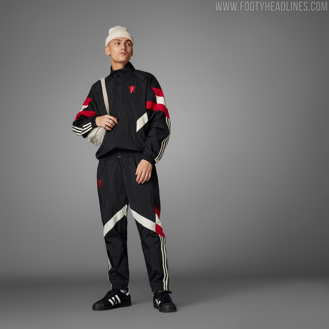 La nueva chaqueta retro Adidas Manchester United 2024-25 presenta un diseño inspirado en los chándales de los años 90, con un color principal negro combinado con detalles en blanco roto y rojo.