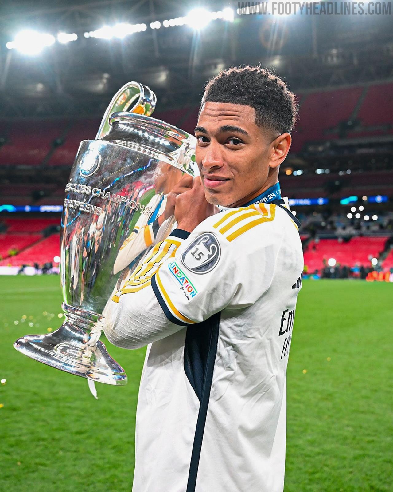 Los jugadores del Real Madrid también vistieron su camiseta local 23-24 con la nueva insignia en la manga de ganador de la Liga de Campeones para celebrar su 15º título de Liga de Campeones.