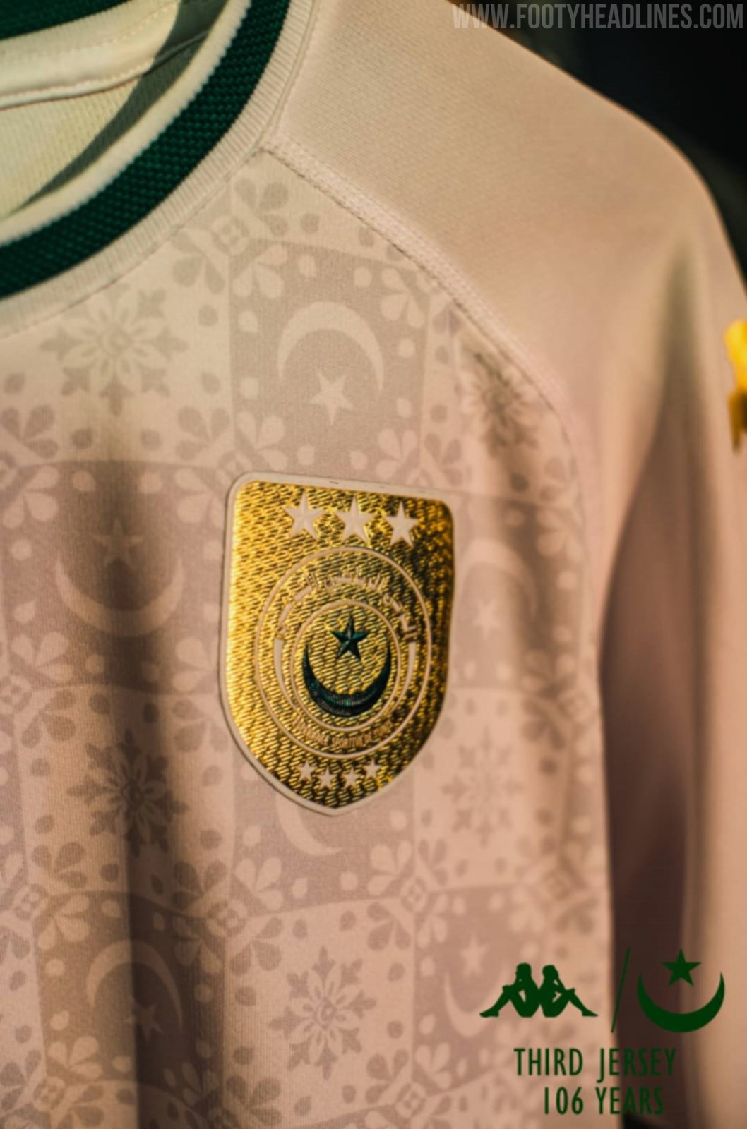 La tercera camiseta del 106 aniversario del Kappa Espérance de Tunis 2024-25 tiene un aspecto muy elegante. La tercera camiseta de fútbol del 106 aniversario del Kappa Espérance de Túnez 2024-2025 combina una base blanca con logotipos dorados metalizados y detalles verdes.