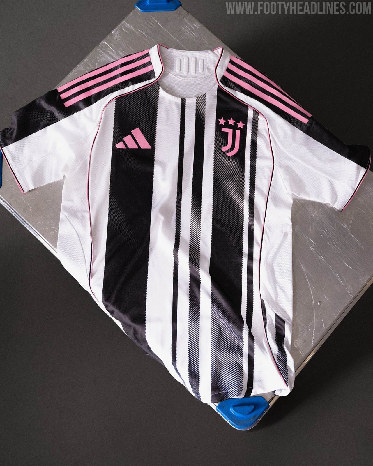 Le maillot domicile Adidas Juventus 2025-26 combine le blanc et le noir classiques du club avec des logos et des liserés roses, une première dans l'histoire de l'équipe. Officiellement, les couleurs sont noir / blanc / rose bise.