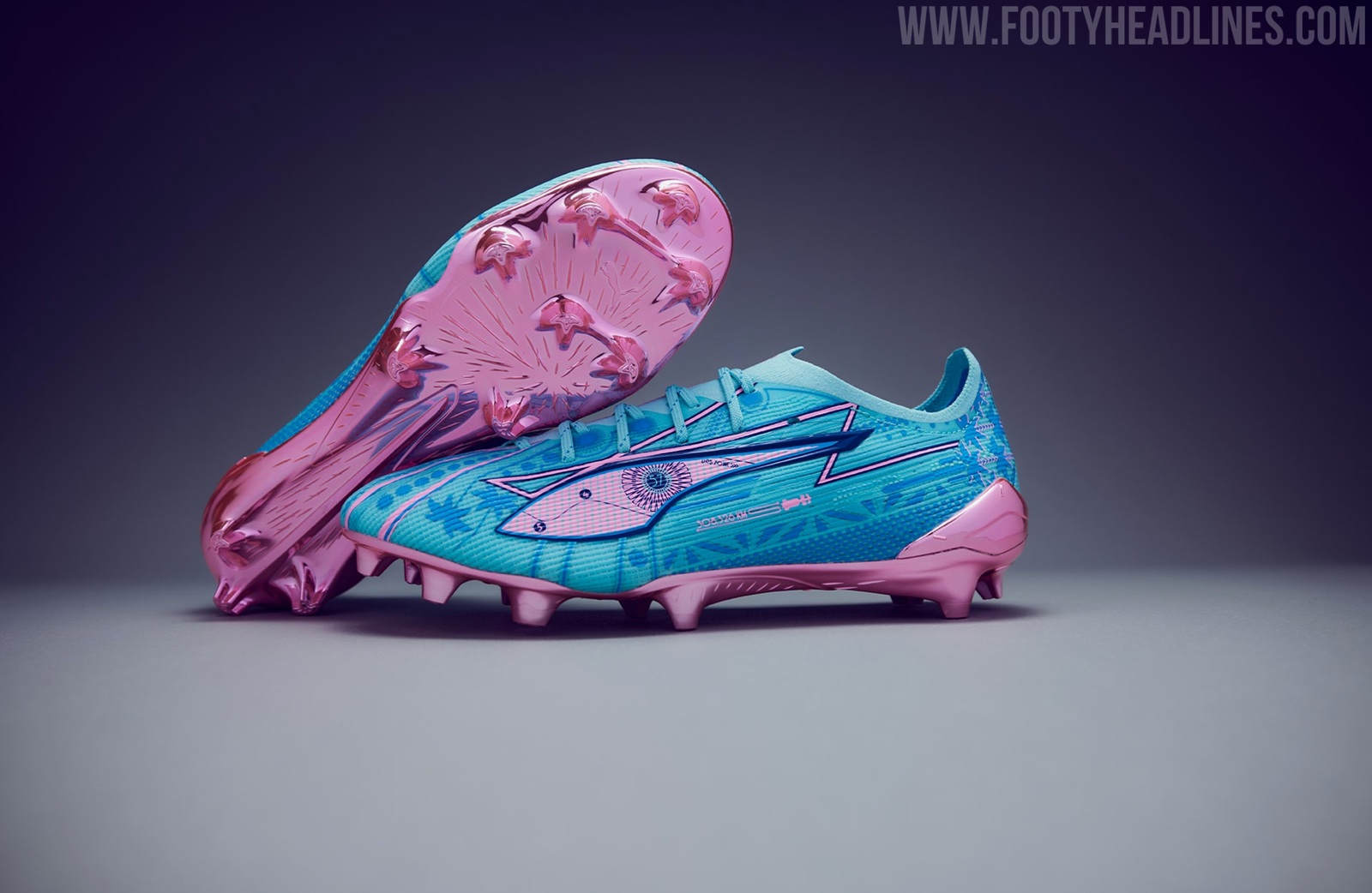 Les chaussures Puma Ultra 5 Ultimate bleu/rose du nouveau pack " F1 Miami " présentent de nombreux détails subtils :
