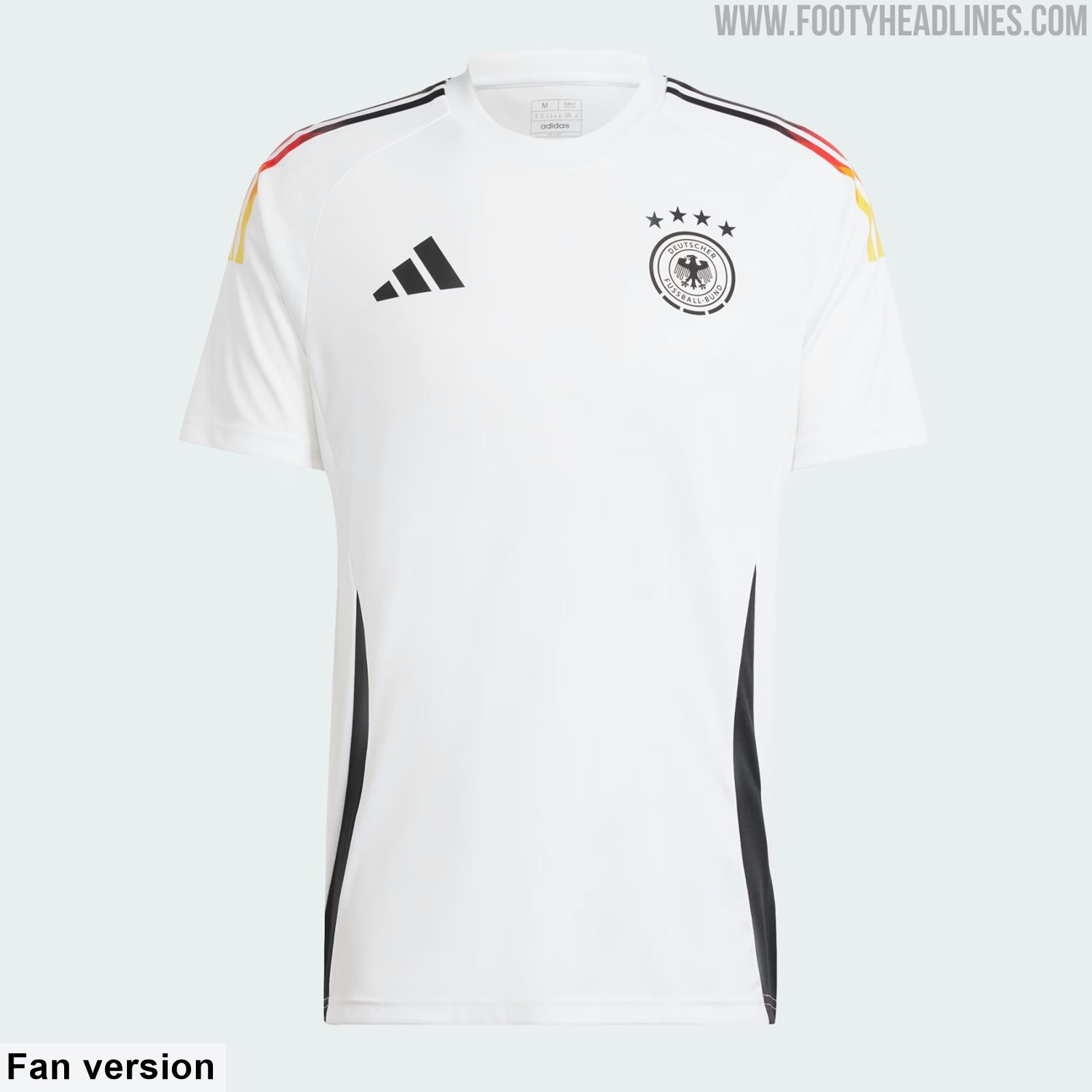 Le maillot domicile Adidas Allemagne 2024 takedown ressemble au maillot domicile officiel mais n'est pas le même. La différence la plus remarquable est que les manches graphiques ont été inversées - le takedown a le design tricolore pour les trois bandes seulement, ce qui donne un look plus propre.