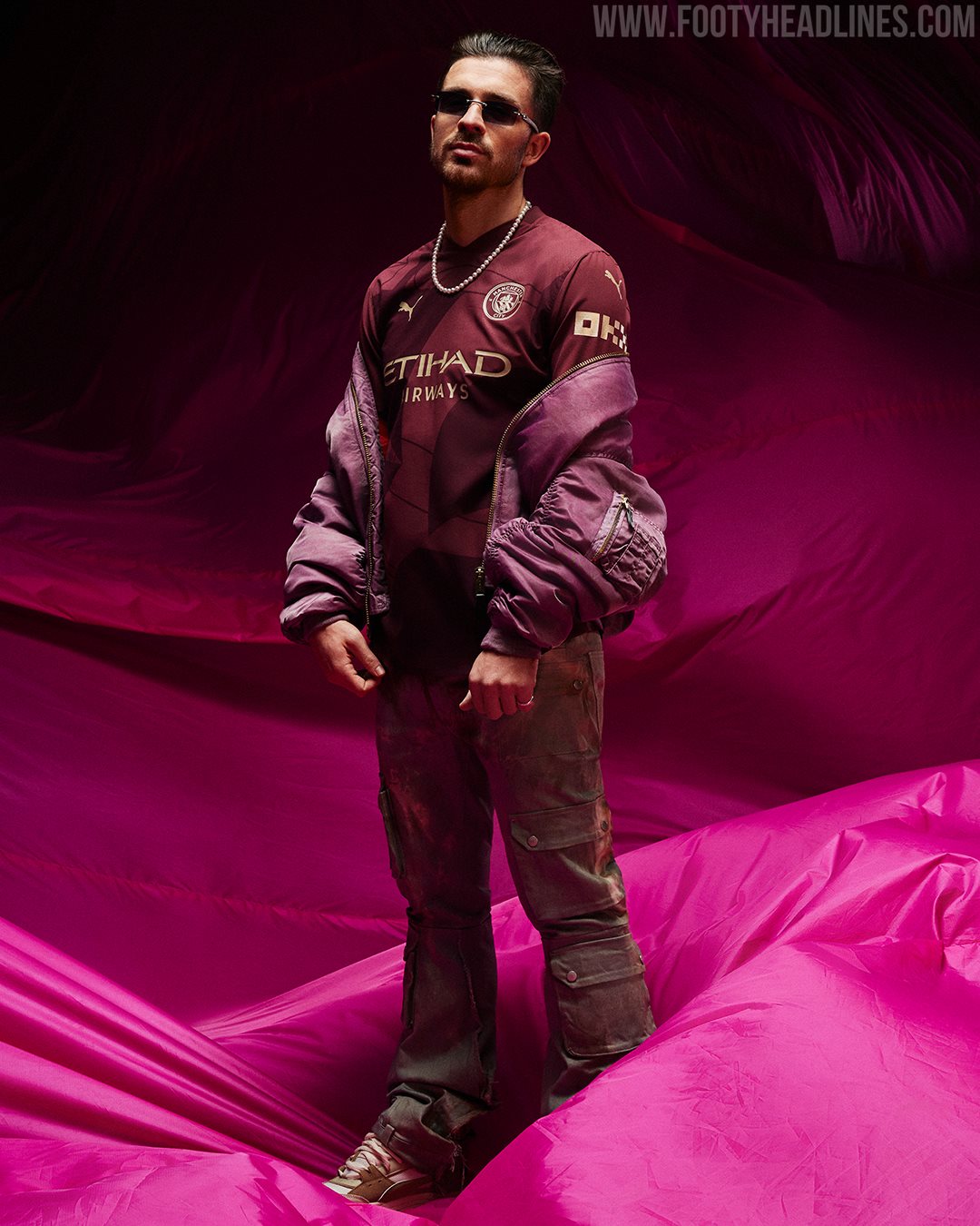 - Design da terceira camisa: A terceira camisa é marrom, uma cor inédita para o clube com a Puma, e apresenta um design gráfico inspirado no brasão do Manchester City.