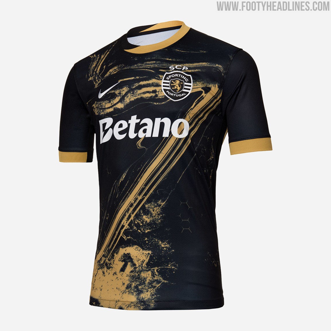 A Nike utiliza um colarinho redondo dividido em metade dourado e metade preto, com punhos das mangas dourados a condizer, para completar a terceira camisa do Sporting 2024-2025.