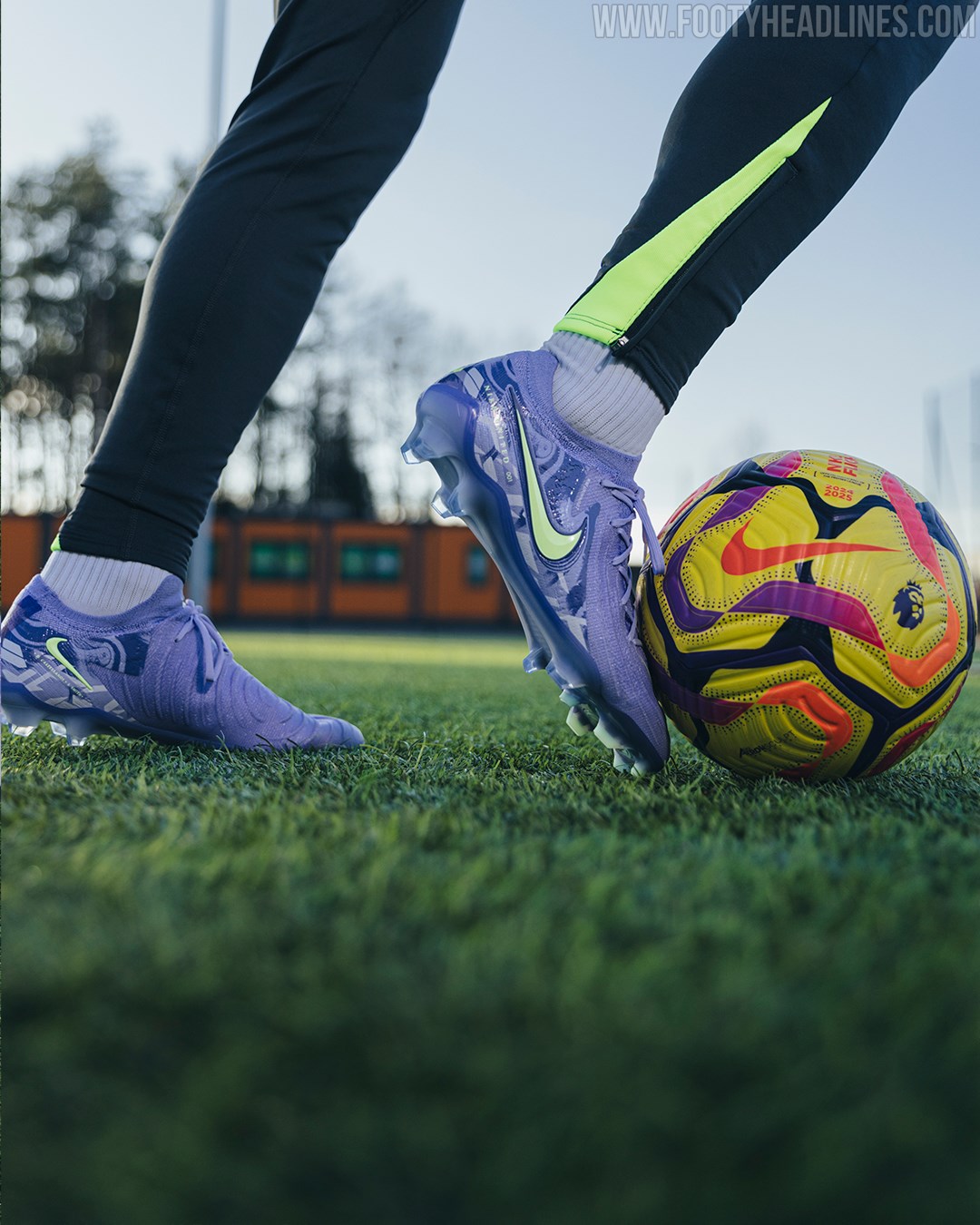 As novas chuteiras Nike Tiempo Legend 10 'United' seguem o esquema dos outros silos da coleção. As chuteiras Nike Tiempo United Pack apresentam uma parte superior em púrpura claro (Purple Agate) combinada com um logótipo Swoosh em volts claros (Barely Volt).