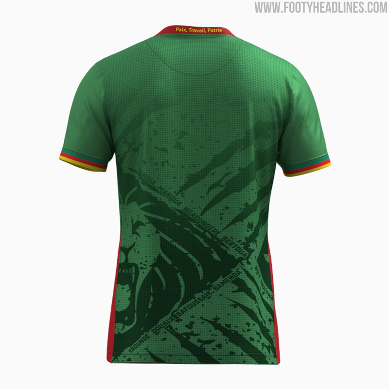 - Design das camisas: A camisa titular é predominantemente verde com um gráfico de leão, a camisa reserva é vermelha com o mesmo design, e a terceira camisa é branca com mangas verdes e um desenho de pincelada com as cores da bandeira dos Camarões.
